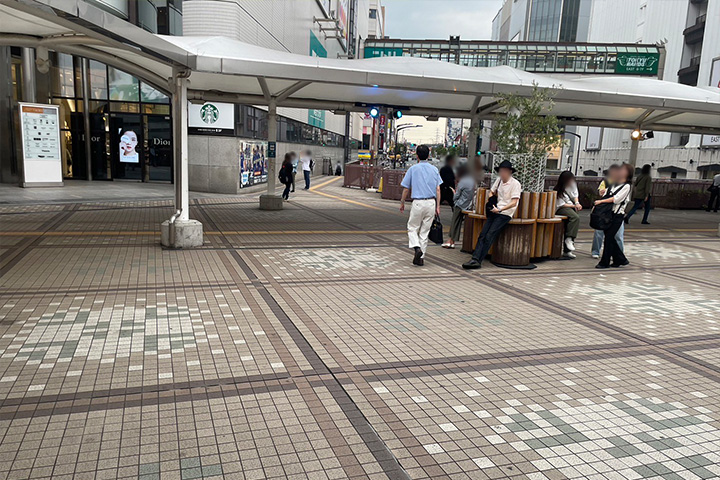 - 直進しますと広場に出ますので、スターバックスの看板を目印に階段をおりていきます