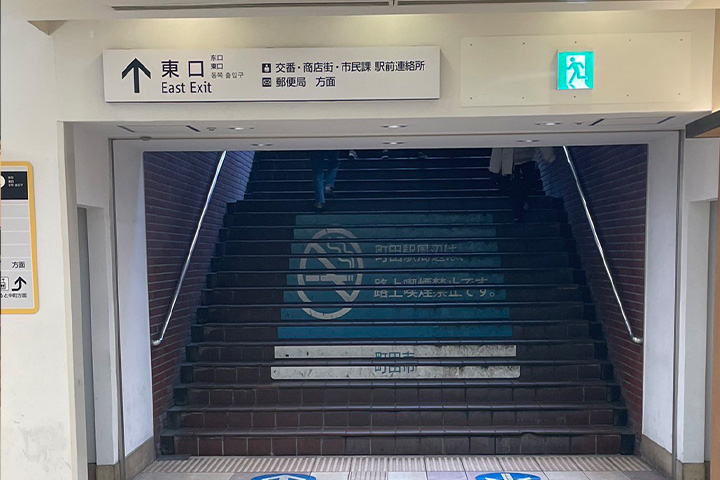 - 突き当たりにある東口出口の階段を登ります。右手にはスターバックスがございます。 ※エレベーターは右手の道なりに進むと右手側にございます